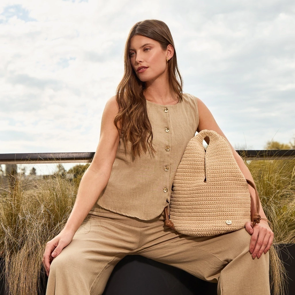 Nos enorgullece presentar AURA , una pieza que va más allá del diseño. Este handbag es el corazón de una colaboración exclusiva con LH Handmade, un grupo de mujeres artesanas que tejen historias de superación y talento. Acompañadas por Construyendo Arg., cada puntada es una fusión de habilidad y propósito, haciendo de esta pieza no sólo un objeto de arte, sino un símbolo de transformación.
