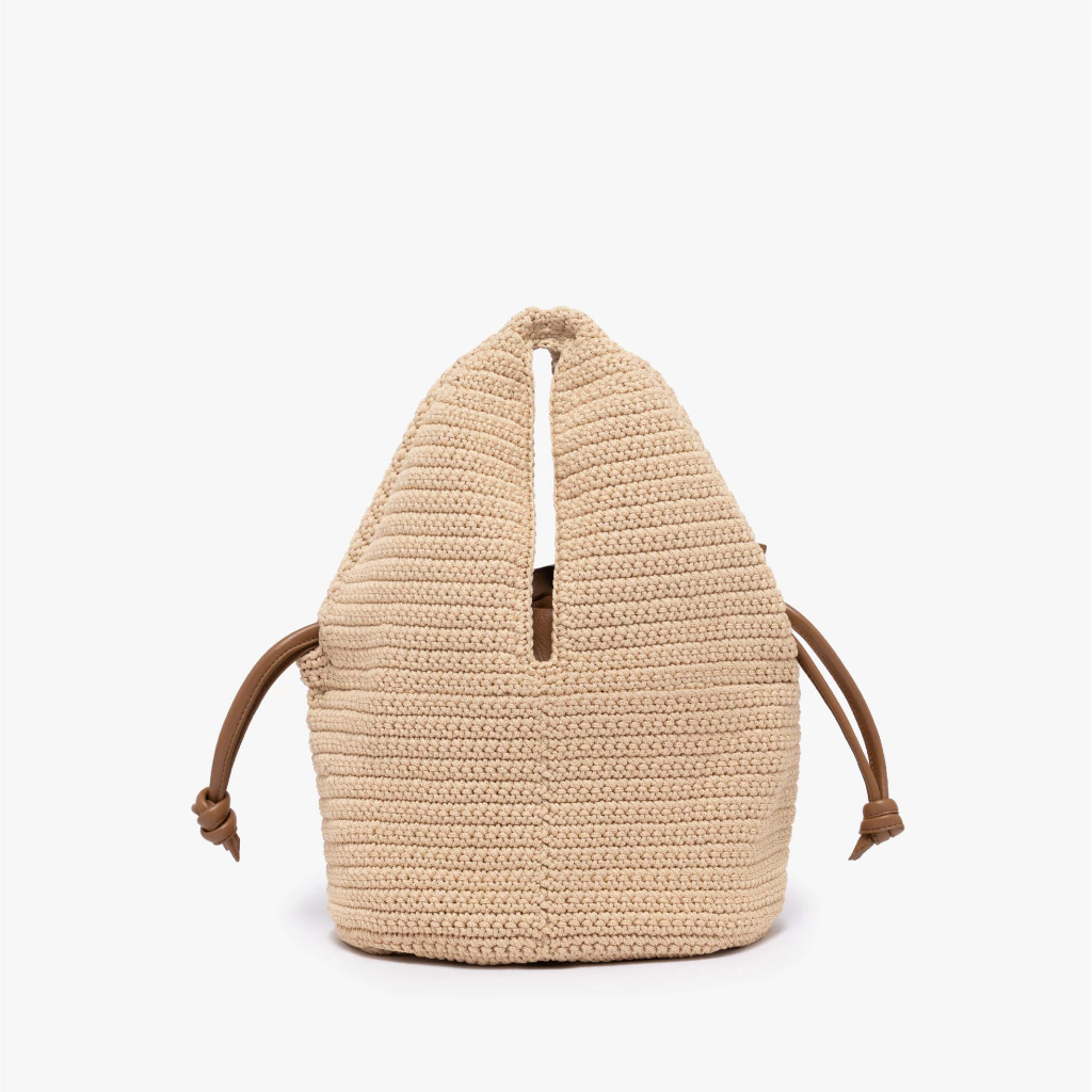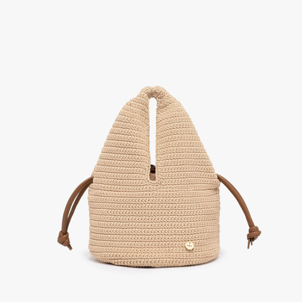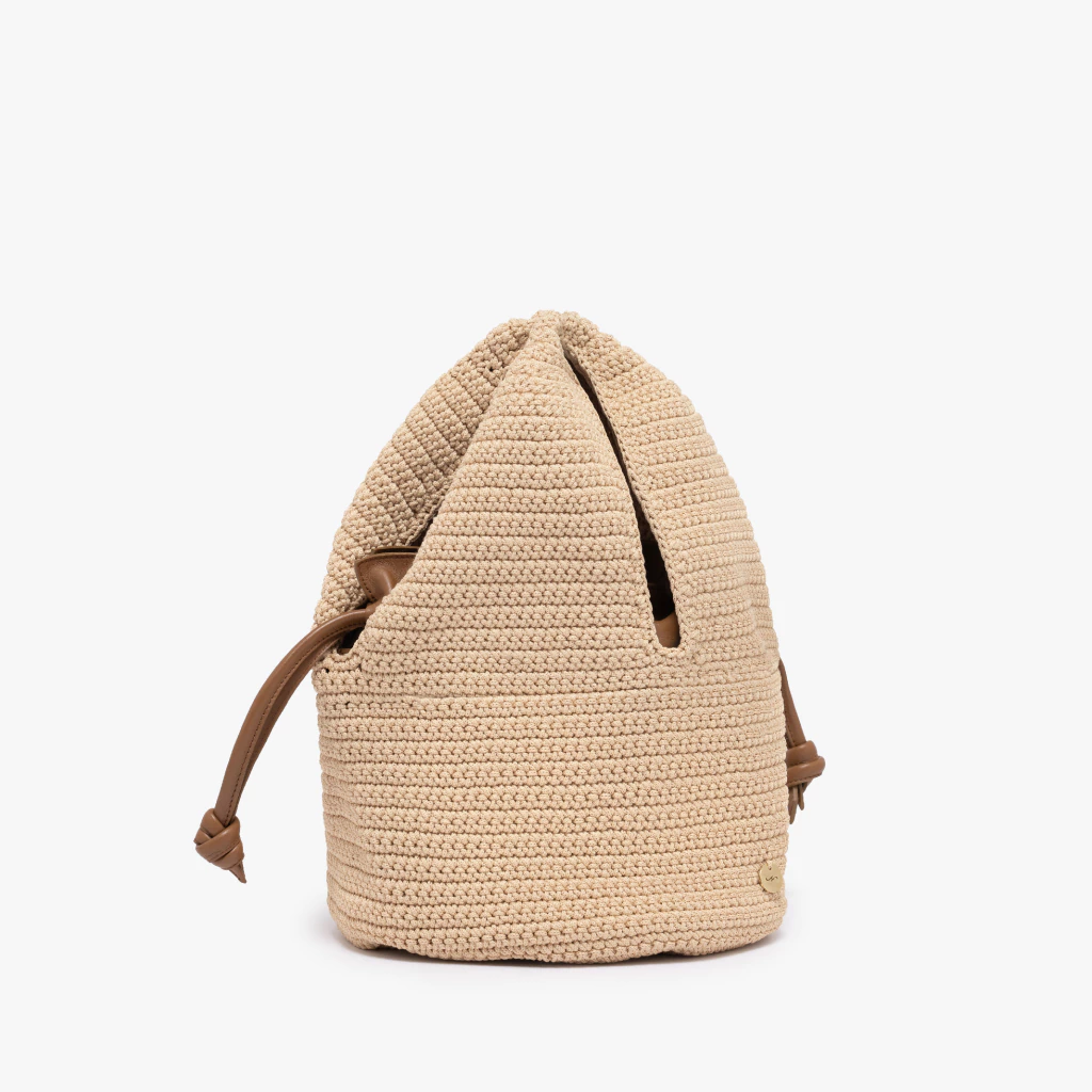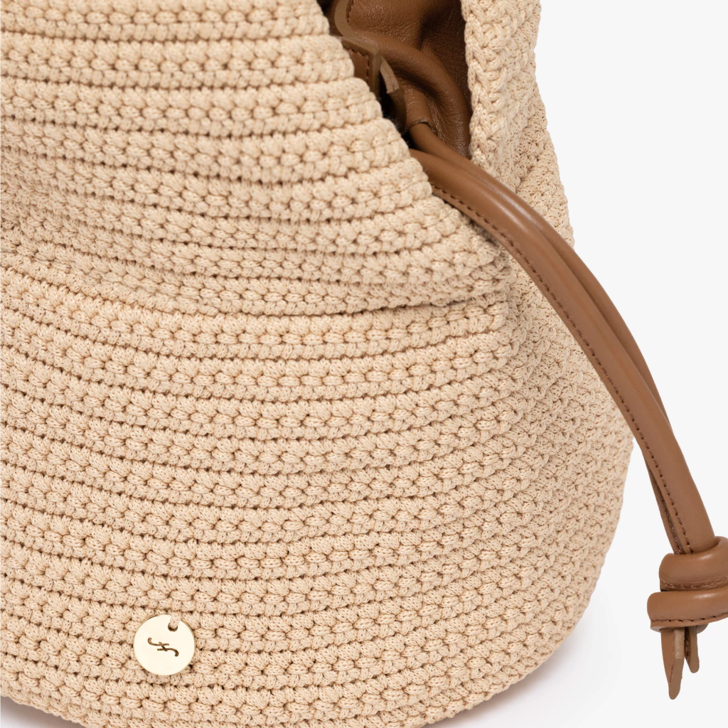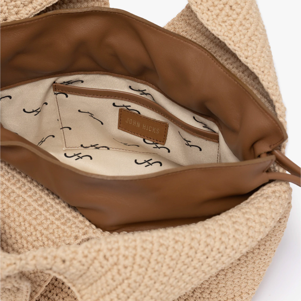 Tejida a mano con hilo de fibra continua, el diseño cobra vida con la incorporación de detalles en cuero natural, material que define a JOHN HICKS. Su diseño funcional incluye cierre fruncido, aportando practicidad con un toque lúdico, mientras que su medalla dorada con logo en el frente actúa como un poderoso sello de identidad.