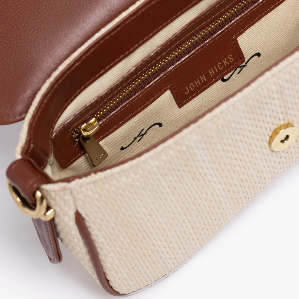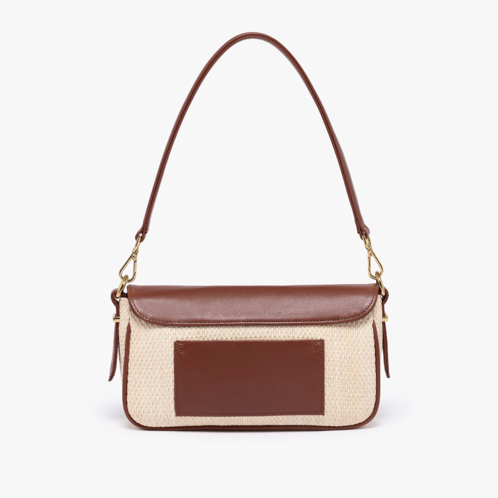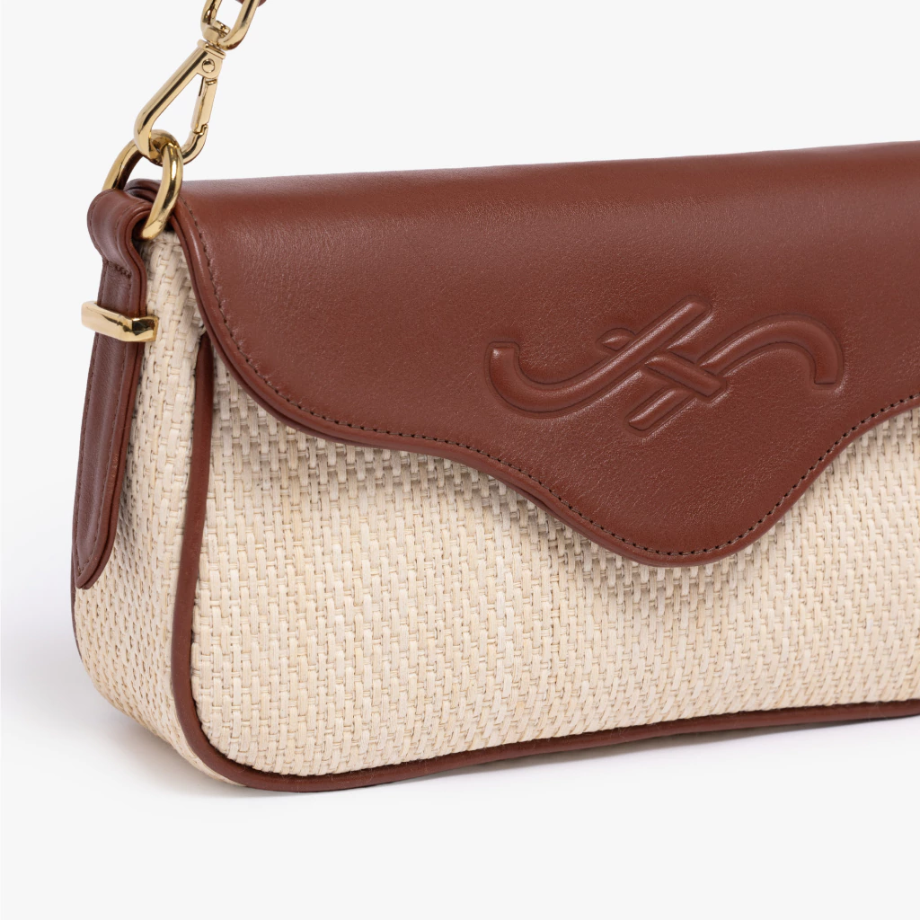 Esta versión está confeccionada en rafia natural y cuero, mostrando una combinación única de texturas. El gran logo frontal, ahora grabado en cuero, le da una esencia sofisticada y artesanal. Los herrajes en baño oro son el toque final que eleva la sencillez de la rafia.